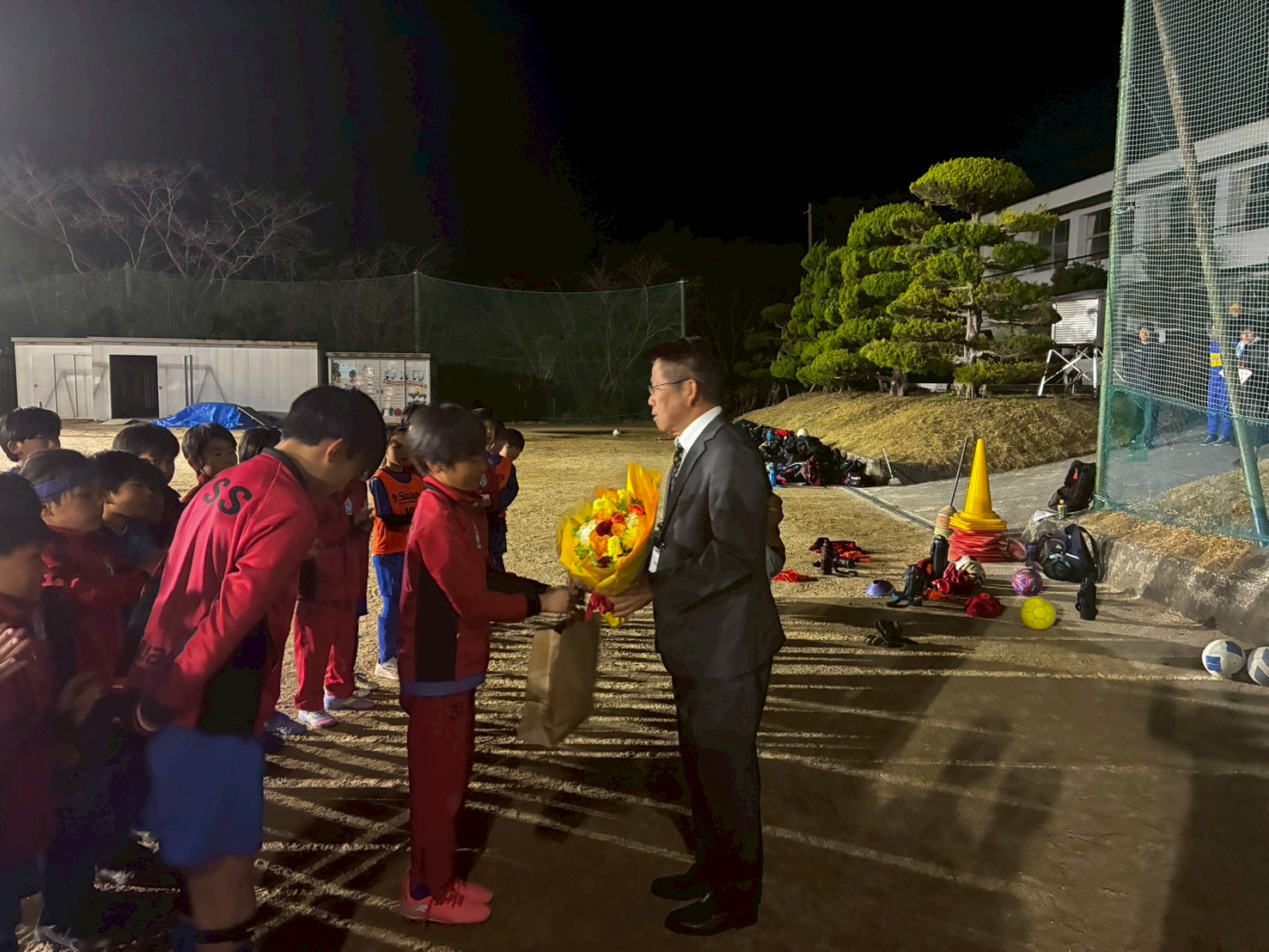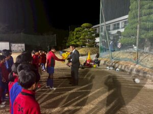 チームを代表し、6年生(28期)キャプテンの浅井結太くんから加藤代表へ花束が贈られ、続いて5年生(29期)キャプテン三輪奏都選手からは記念品が贈られました。