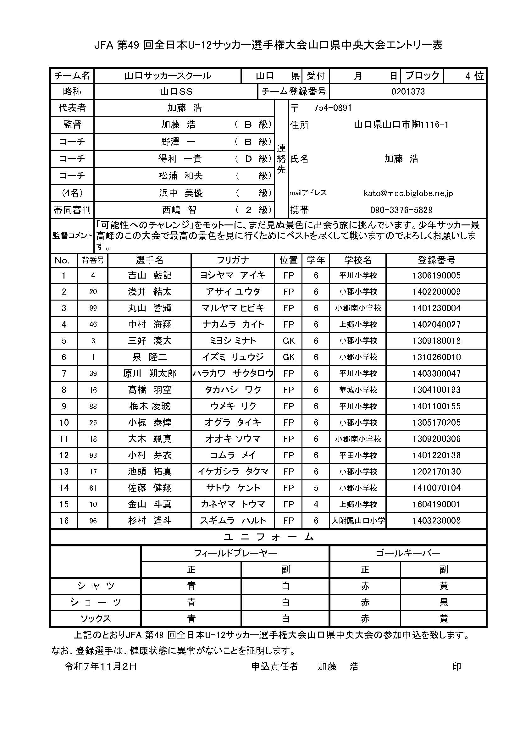 この大会最多優勝回数9回を誇る山口SSは、山口ブロック予選を4位とぎりぎり通過で2年連続18回目の出場を果たしました。